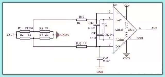 在使用PT100測溫時,通常用惠斯通電橋來實現(xiàn)。即利用三個定值電阻和PT100組成惠斯通電橋,當溫度發(fā)生變化時導致PT100阻值發(fā)生變化,從而使電阻兩端的壓差發(fā)生變化。 ![]() 后端處理電路以AD620/AD623查分運放為例,通過調節(jié)電阻R51可以設置查分運放的放大倍數(shù),信號經過調理后可以進入單片機進行AD采樣。如下的電路,是我應經成熟應用的,產品已經量產多年,比較穩(wěn)定,大家可以參考。 ![]()