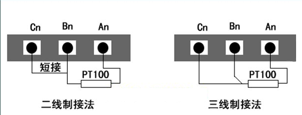 PT100的接線方式有四線制、三線制、兩線制,在采樣精度要求不是非常精確的情況下,三線制用的比較多。如下圖所示,是PT100的三線制和兩線制的接線方法。