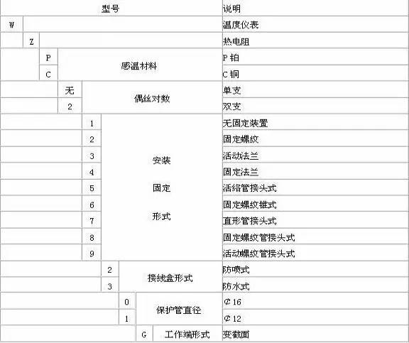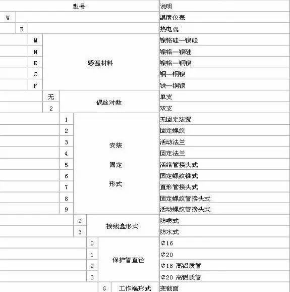 我們常見的測溫點很多,有電阻,電偶,雙金屬,還有帶溫變的測溫點,我們?nèi)绾沃浪囊?guī)格型號呢,不多說了,上圖